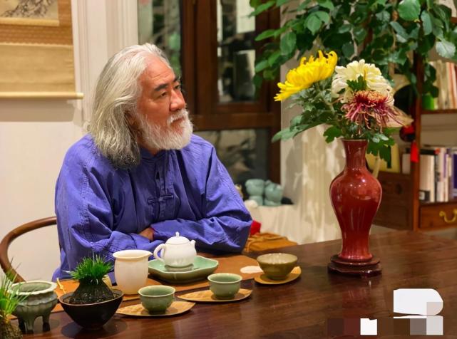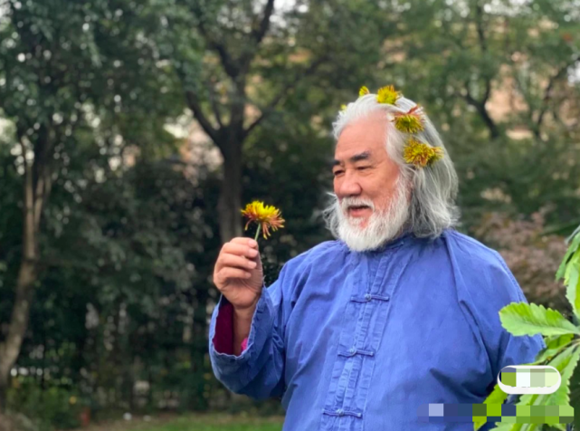 照片中已经69岁的张纪中穿着一件深蓝色大褂,杜星霖在他花白的头发上插满了黄色菊花,和背后郁郁葱葱的树木相映,看起来倒是有一种身处世外桃源的感觉。