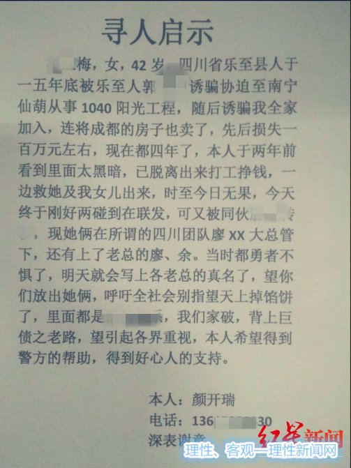 与黎鹏通电话那天的晚上,颜开瑞突然在朋友圈发出一张寻人启事寻找黎玉梅,称其和女儿2015年底被人诱骗胁迫至南宁仙湖,从事1040阳光工程,让自己家破人亡。颜开瑞在朋友圈表示,自己两年前看到里面太黑暗,已经脱离出来。一遍打工挣钱,一边救黎玉梅和女儿出来,但至今日无果,他希望引起各界重视。朋友圈内容还说,要“将遗体捐出给社会,让更多的人替在里面受胁迫的人伸出援手”,“将(把这份寻人启事)不遗余力贴满全仙湖”。